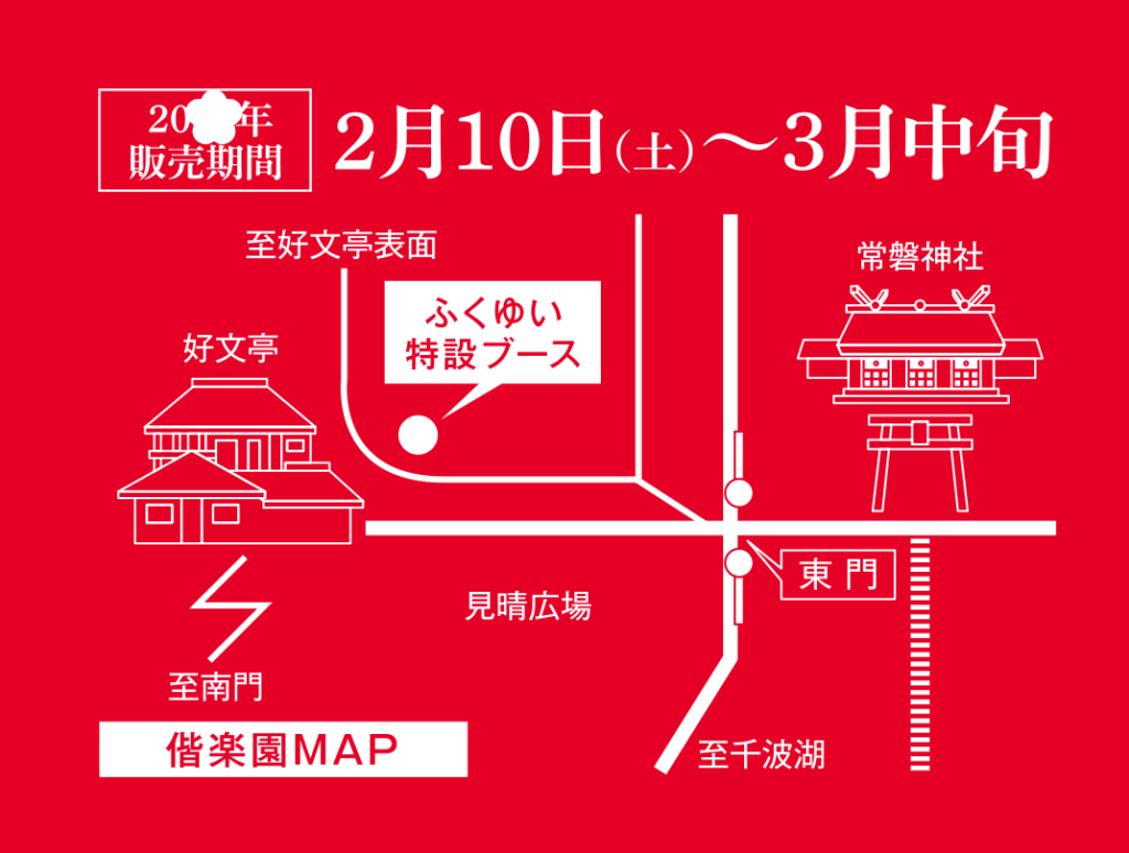 開催期間:2026年2月11日(火祝)〜3月中旬 営業時間 朝9:30〜16:00 ※雨天・荒天時は休止となります。 開催場所:水戸偕楽園 販売場所:偕楽園本園「ふくゆい」特設ブース、または各店舗(各店舗へは直接お問い合わせください)。 アクセス